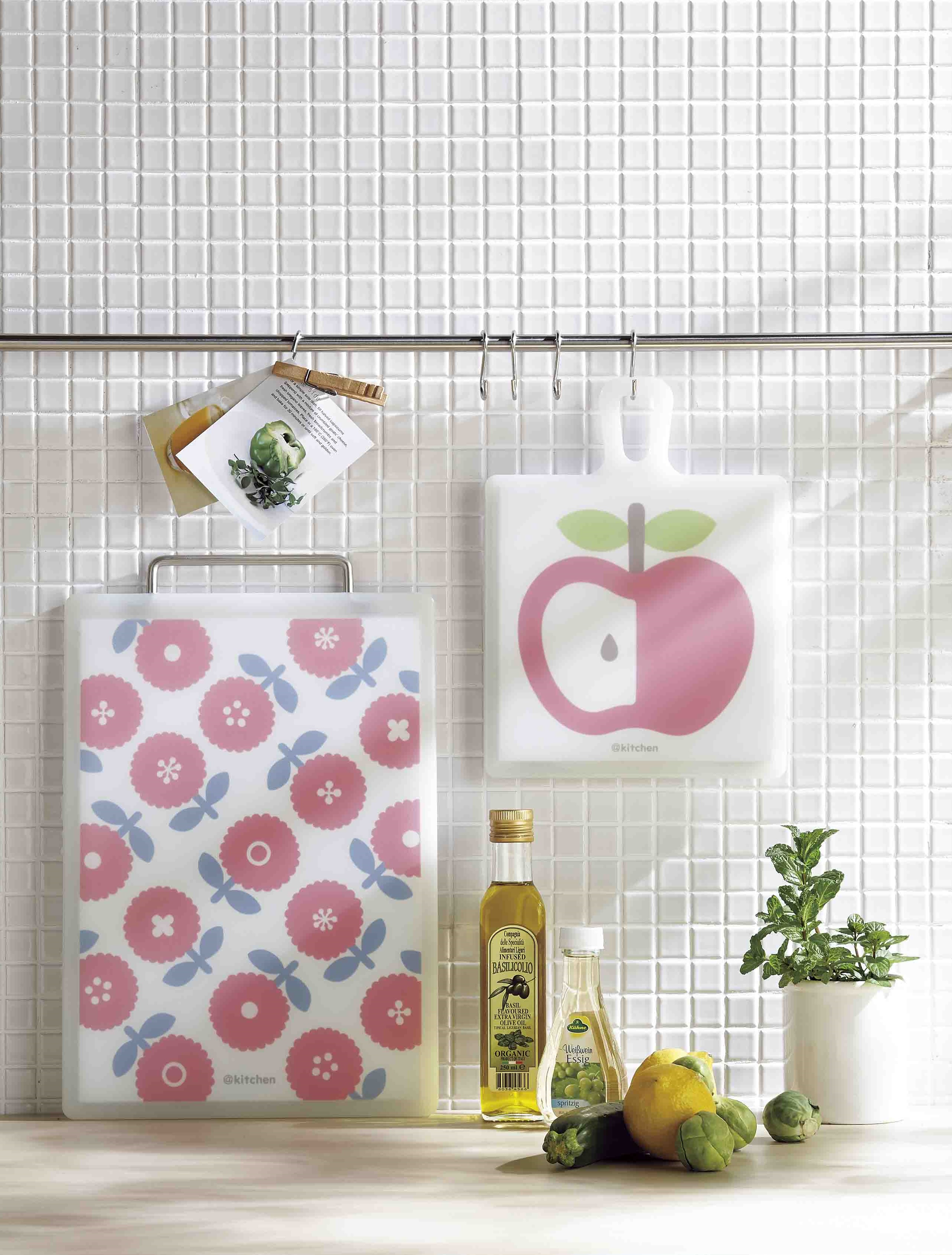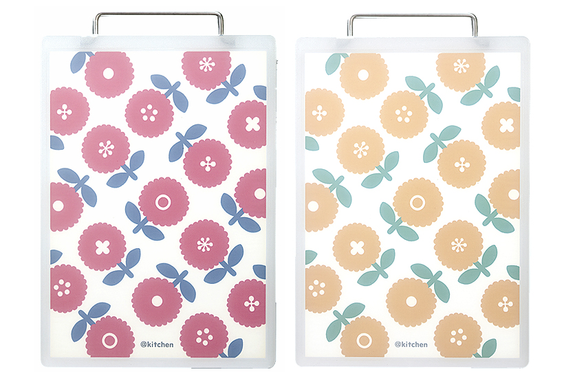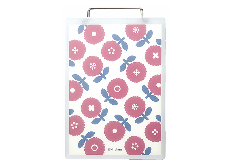 持ち手がついているので、フックにかけて見せる収納にしても可愛いらしい印象に。まな板の中にデザイン紙を挟んでいるため、繰り返し洗っても色褪せる心配はありません。